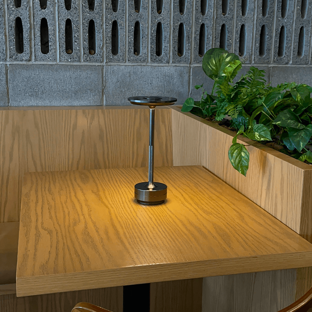 Metal plating insures a subtle color reflection and superior durability. Wireless and rechargeable to allow for mobility, elevating the mood of any space you enter.